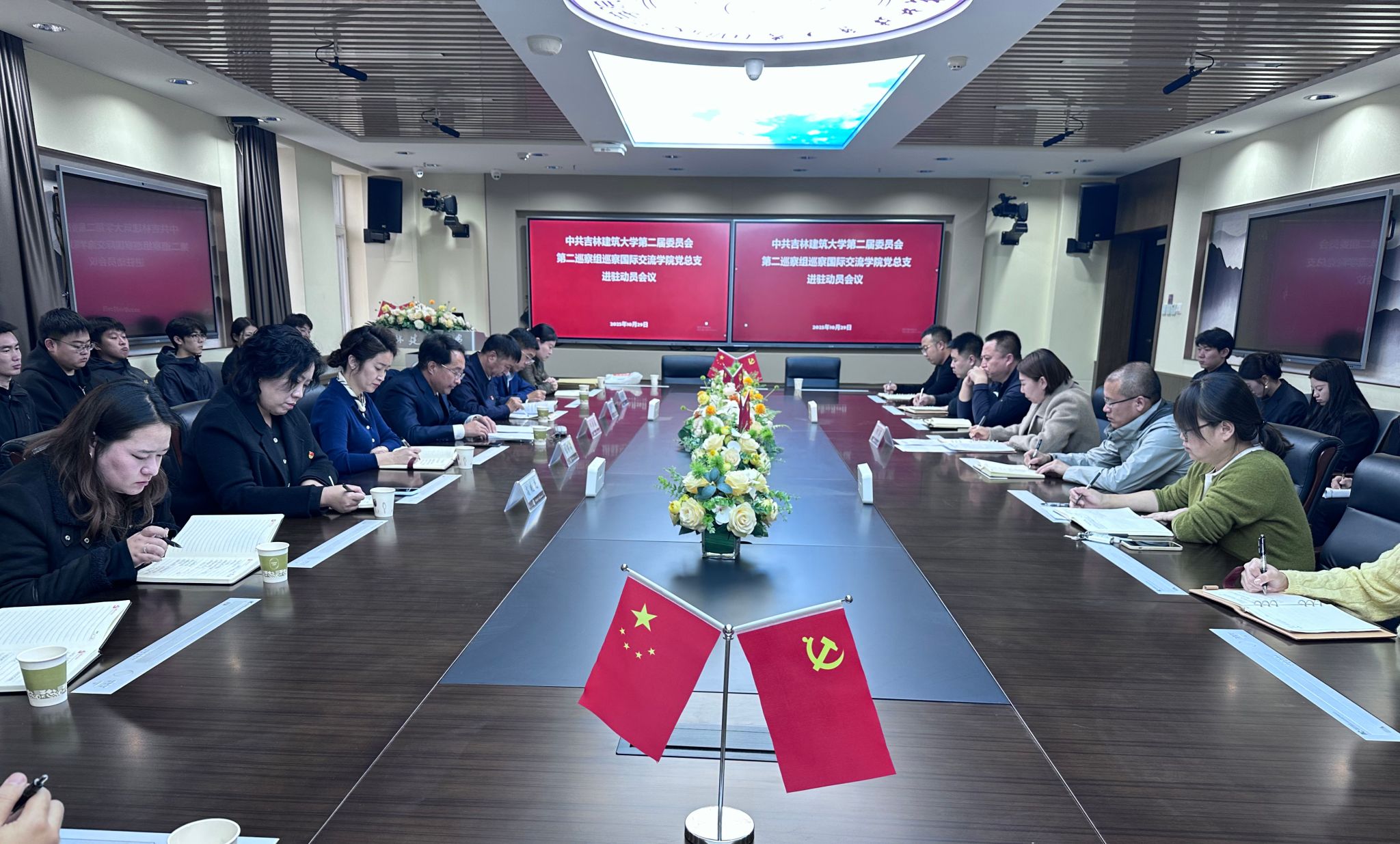 根据学校党委巡察工作统一部署,10月29日,学校党委第二巡察组巡察国际交流学院党总支进驻动员会议在图书馆智慧型国际信息化中心召开。会前,巡察组组长韩成浩主持召开了与国际交流学院党总支书记刘菲的见面沟通会。会上,学校党委巡察办公室主任周文山代表巡察工作领导小组提出希望和要求,韩成浩作了动员讲话,国际交流学院党总支书记刘菲主持会议并作表态发言。