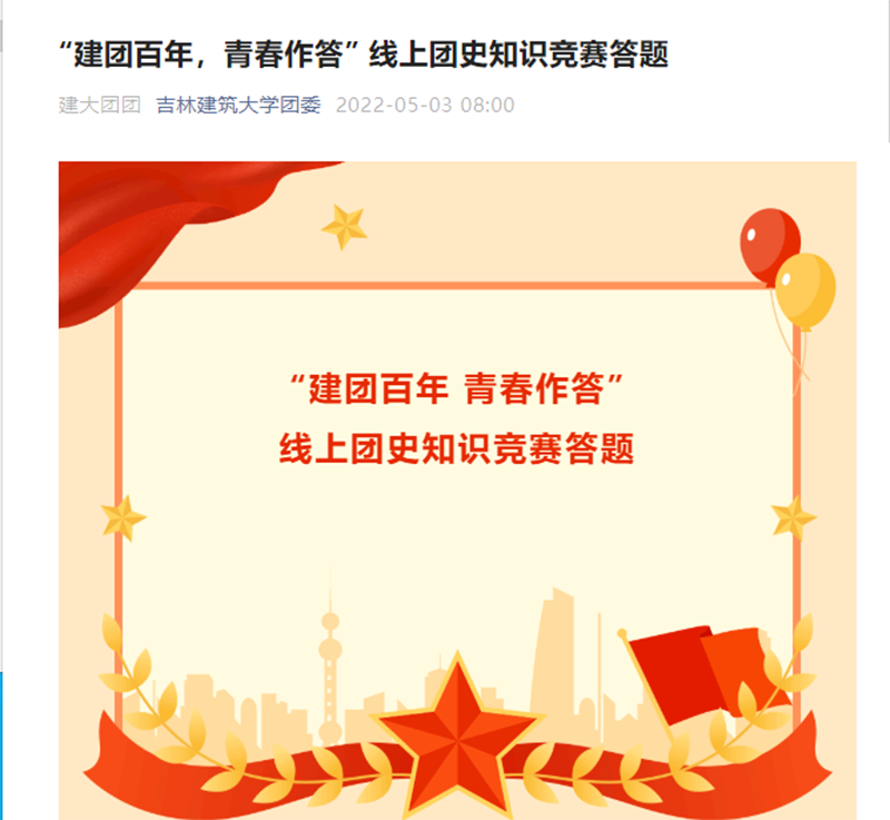 学校各级团委围绕“建团百年 青春作答”、“喜迎二十大 团史青年说”主题,开展了线上团干部讲团课、团史故事分享会,活动覆盖全校青年学生;在微信小视频、微博等新媒体平台,发布了建大青年大合唱《光荣啊!中国共青团》、《有我》《永远跟党走》建大学子青春接力宣传视频;组织开展了2022年入团仪式,进一步加强共青团队伍建设。
